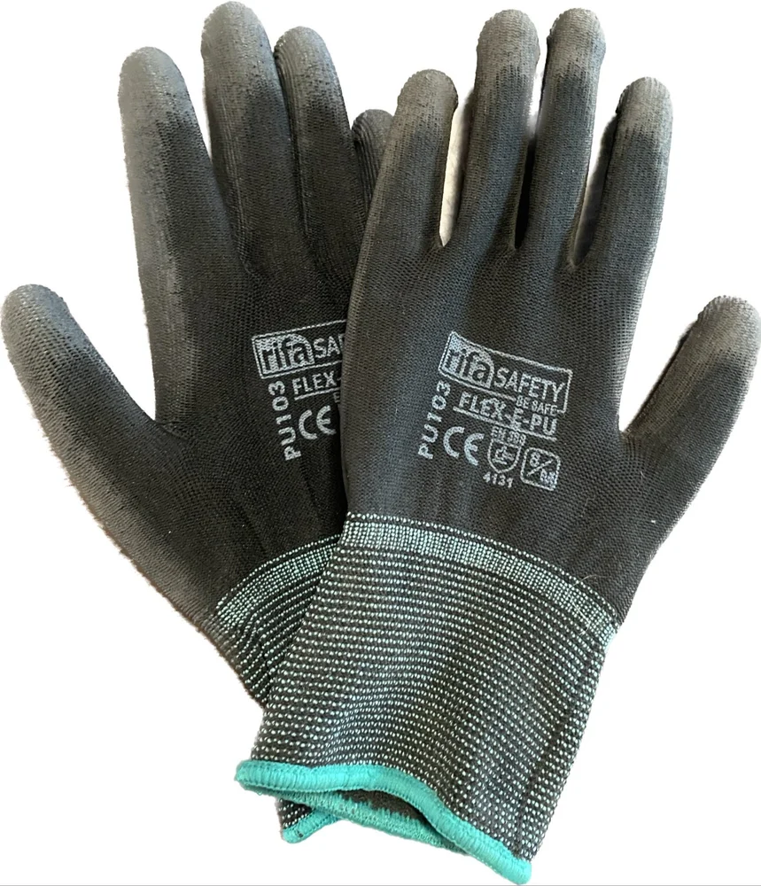 The PU 103 BB Rifa Safety Gloves are made from high-quality polyester with a polyurethane (PU) coating, designed for durability and protection in industrial applications. These gloves feature a seamless construction for comfort, a nylon liner for flexibility, and a knit wrist cuff that ensures a secure fit.